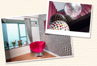 房間白色的牆身,飾上花碌碌的幾何圖案,令人有疑幻疑真的感覺。